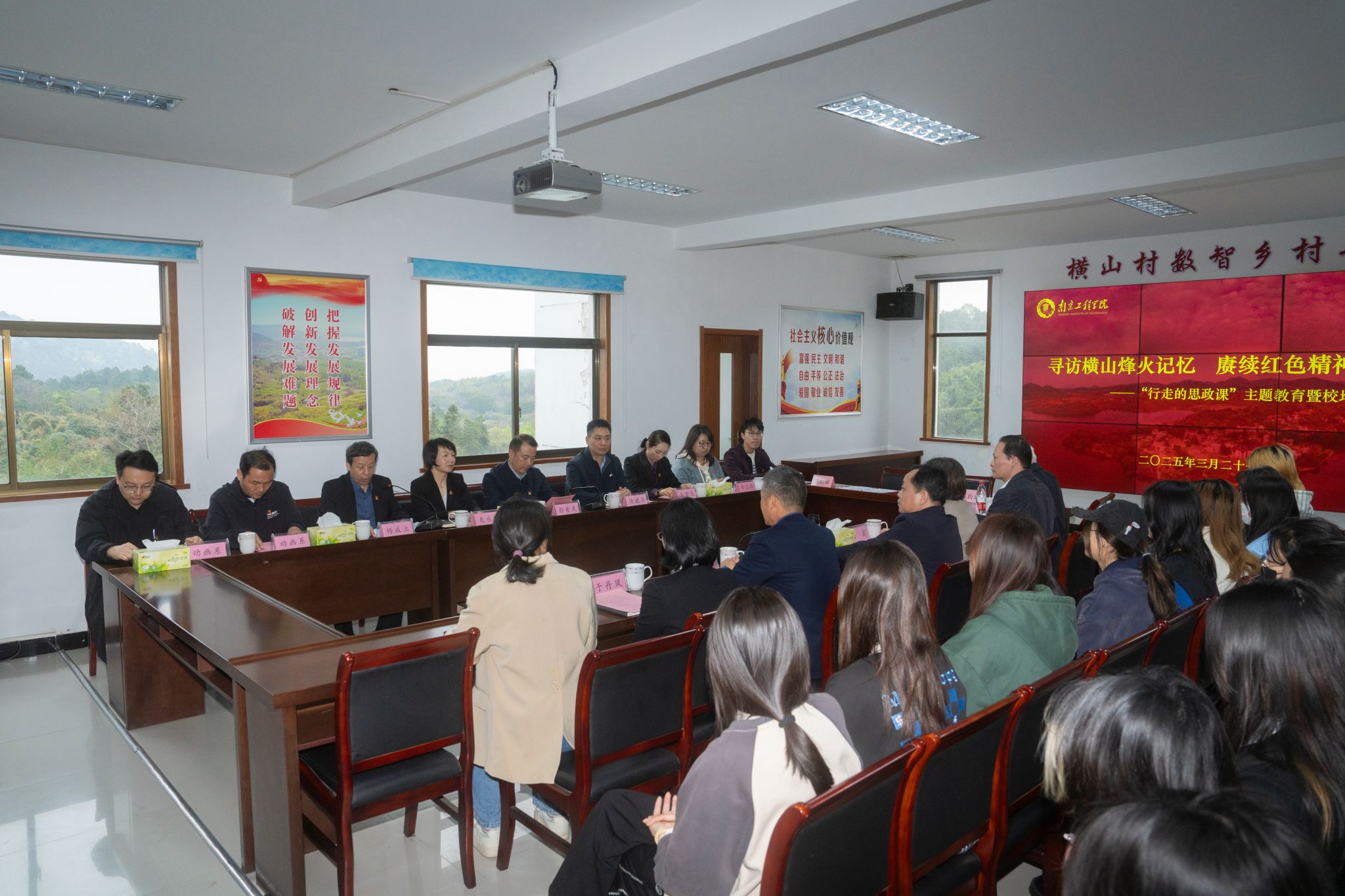 为进一步加强红色文化育人,推动和深化校地合作,3月27日,党委书记孙爱武以“第二班主任”的身份带领动画241班全体同学前往横山新四军革命纪念馆,开展“行走的思政课”主题教育暨校地共建活动。党委常委、宣传部部长陈建华,艺术与设计学院、马克思主义学院负责人,及学院辅导员、班主任一同参加了此次活动。同时参加活动的还有江宁区横溪街道党工委书记詹军、党工委副书记马兴余,横溪街道办事处、横溪街道横山村等相关负责人。