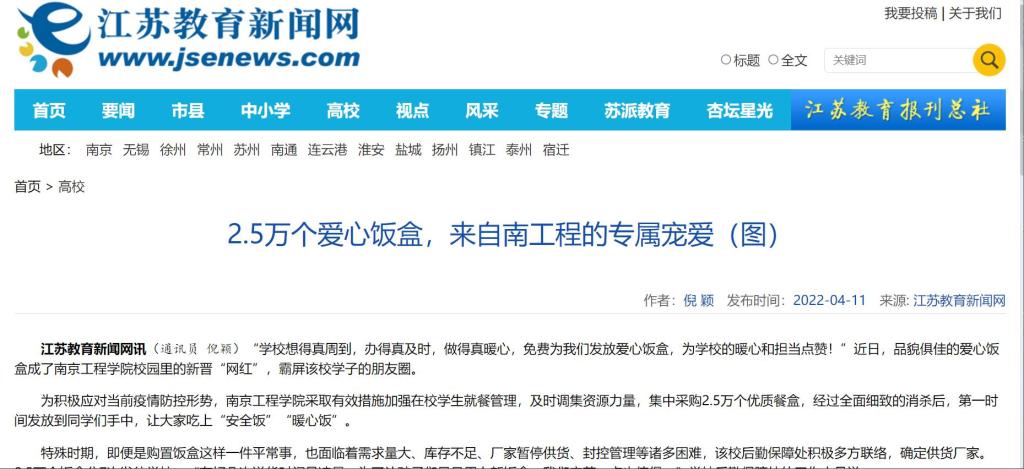 《江苏教育新闻网》:2.5万个爱心饭盒,来自南工程的专属宠爱(图)