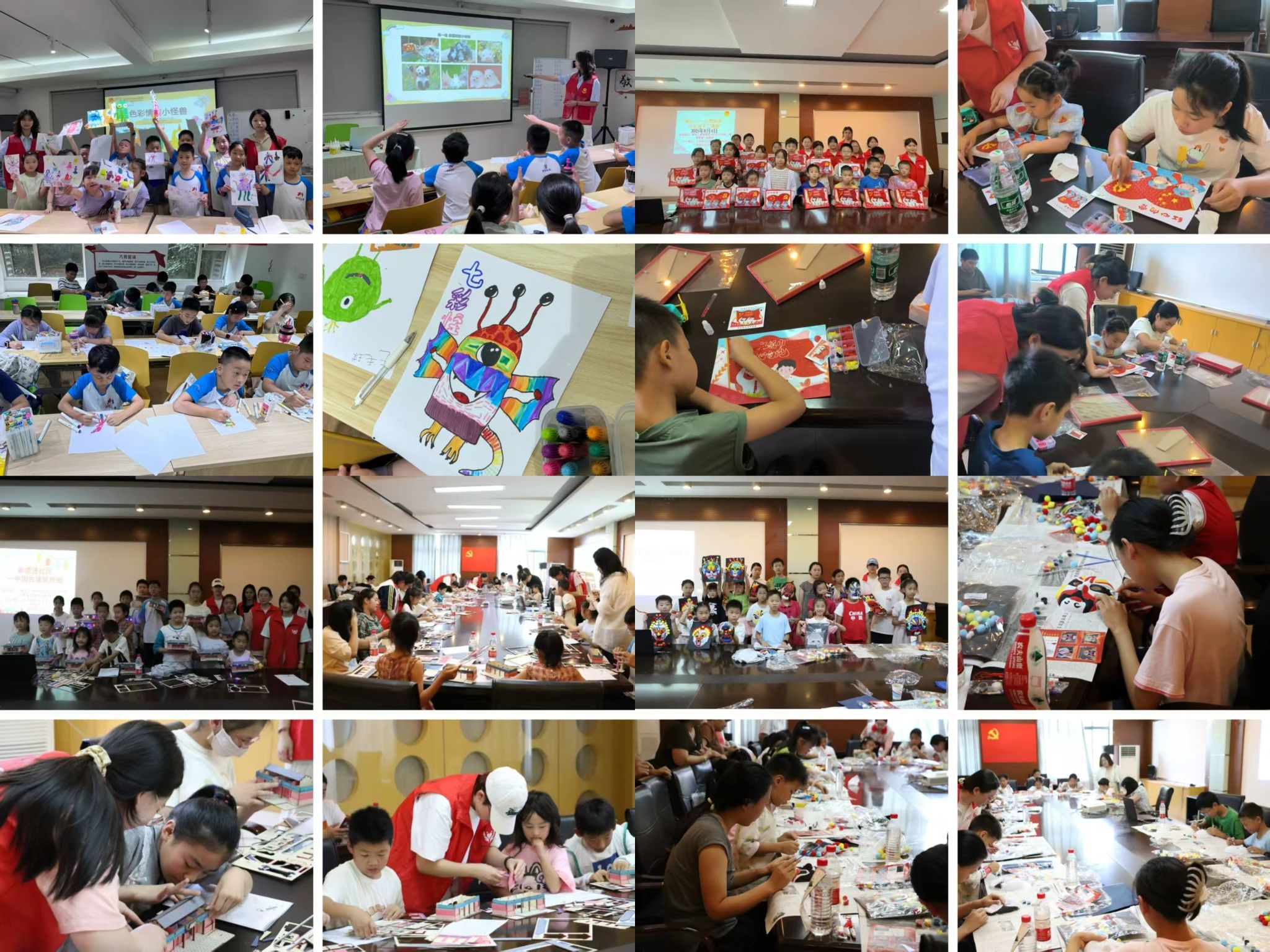 在江宁区牌坊村,“童梦引航”实践团开展非遗手作、乡土艺术创作、心理关怀与课业辅导等活动7场,服务200余人次,还与书法协会联合开展“书画染韵融合课程,将扎染与书法艺术相结合。青春筑巷实践团在秦淮区汇幸苑社区组织古建筑模型拼搭、川剧脸谱彩绘、编织竹扇等非遗活动,并开展小小红军包缝制、纽扣党旗拼贴等红色教育活动。艺彩童心”等多支实践团开设艺术课堂,通过绘画创作、色彩体验等课程,激发孩子们想象力与创造力,播撒艺术种子。